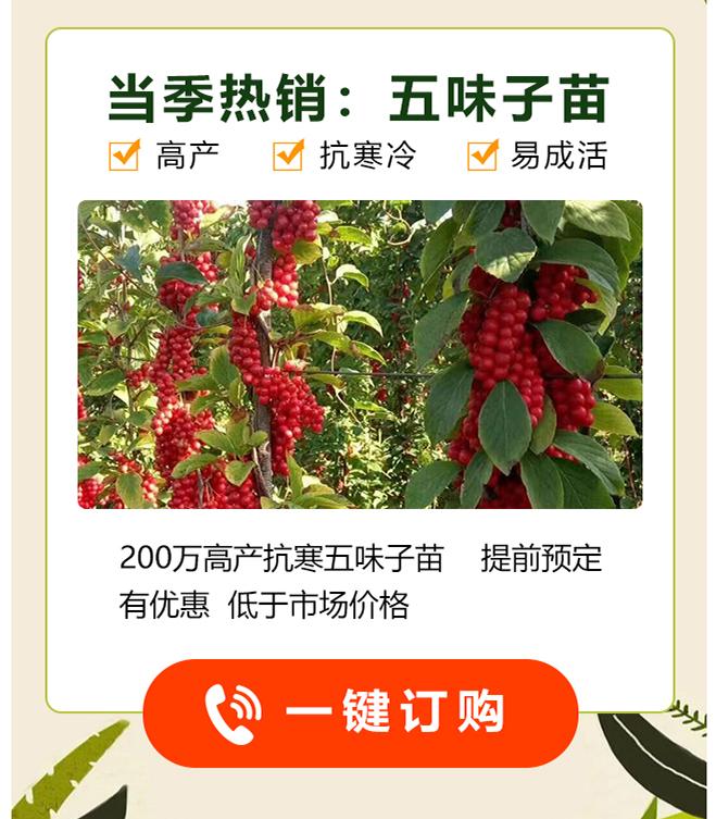 主营:五味子苗、花楸苗、百花花楸苗、红豆杉苗、红松苗、刺槐苗、九角枫苗、扭劲槭苗、刺五加苗等