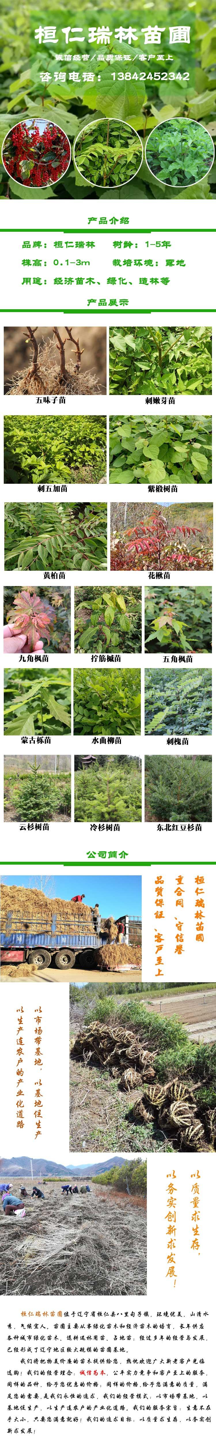 主营:五味子苗、紫椴树苗、刺嫩芽苗、花楸苗、水曲柳苗、刺五加苗、蒙古栎苗、九角枫苗、黄柏苗、云杉苗、冷杉苗