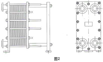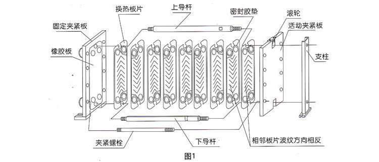 板式换热器的结构分解如图:1,产品外型如图2,主要部件是由换热板片、密封胶垫、夹紧板、导杆、夹紧螺栓组成。换热板片是由不锈钢板压制成型,它上面开有4个流道孔,中部压成人字形波纹,四周压有密封槽。密封槽内粘有密封胶垫。换热板片通过两导杆定位对齐,两夹紧板通过夹紧螺栓将各板片压紧,从而形成换热器内腔换热流道。相邻换热板片的人字形波纹方向安装时相反,接触点彼此相互支撑。人字形波纹和这些支撑点使流体介质在其内部流动时充分形成湍流,这是板式换热器具有很高换热效率的主要原因。另外换热板片厚度较薄,导热热阻较小,板片两侧的流体介质流动分布较为均衡,也使得传热较为充分。