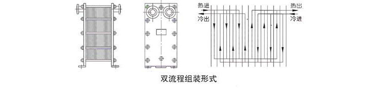 板式换热器根据介质的温差和流量,可以装配成单流程、双流程、三流程以及多流程的形式。单流程是指介质在换热器内流过一个流程,双流程是指介质在换热器内折返流过两个过程,依次类推,各种流程的外形图和其流程示意图如图3。当采用多流程时,换热器的四个接口就不能在同一侧的夹紧板上,进出口要位于前后两个夹紧板上。