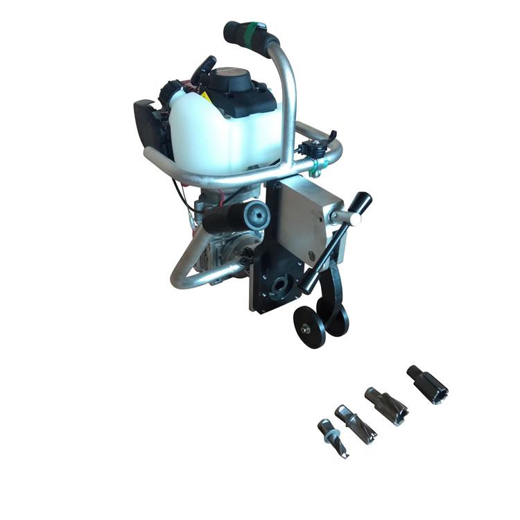 内燃钢轨钻孔机是铁路工务、电务部门钻制钢轨夹板螺栓孔的专用机械。以小型汽油机为动力,经过减速器带动主轴旋转,手柄驱动齿轮拨动齿条实现进给,配有高压水壶,空心钻头在冷水的辅助下延长了钻头的使用寿命。本机具有体积小、重量轻、钻孔效率高、夹轨牢靠、使用方便、钻孔位置准确等特点。适用于43~75kg/m各种型号钢轨。