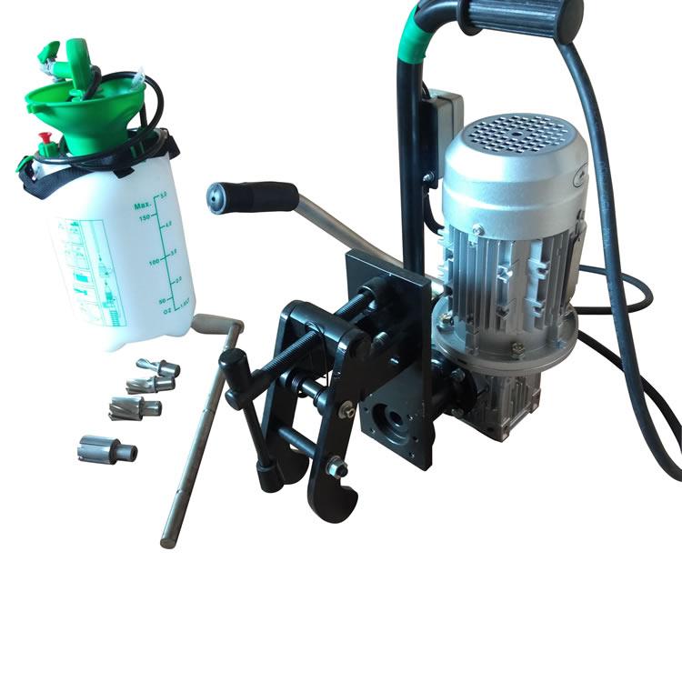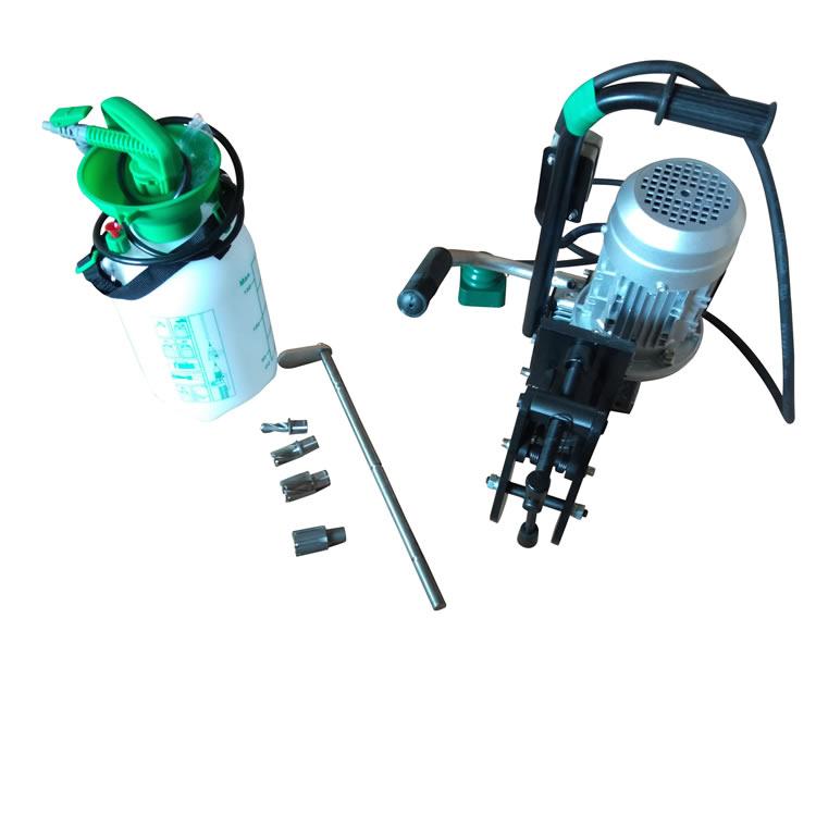 电动钢轨钻孔机是铁路工务、电务部门钻制钢轨夹板螺栓孔的专用机械。以小型电机为动力,经过减速器带动主轴旋转,手柄驱动齿轮拨动齿条实现进给,配有高压水壶,空心钻头在冷水的辅助下延长了钻头的使用寿命。本机具有体积小、重量轻、钻孔效率高、夹轨牢靠、使用方便、钻孔位置准确等特点。适用于43~75kg/m各种型号钢轨。
