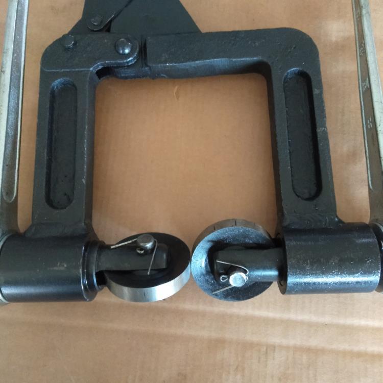 该倒角器是用于对铁路钢轨轨腰上的孔进行倒角。其结构:它有一个门形框架,由左支架和右支架通过一套四连杆机构铰链而成,锁紧杆上端装有手柄,左支架下端的轴套中装左轴,左轴右端装有圆盘状刀片,左轴左端装有棘轮扳手,右支架下端的轴套中装有右轴,右轴上套装一个压紧弹簧,右轴左端装有圆盘刀片,右轴右端装有棘轮扳手。它结构简单,使用方便,工作效率高,其刀片呈圆盘状,整个圆周上的刀刃锋利耐磨,使用寿命长等优点。