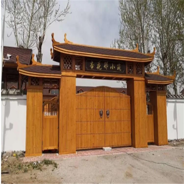 景区木结构大门高端大气,简约中透露着端庄的古典气息,充满浓郁人文底蕴,质朴的木结构与景区的风光浑然天成,完美融合。这类大门适合建设于风景旅游区、绿化园林、田园小院等地。
