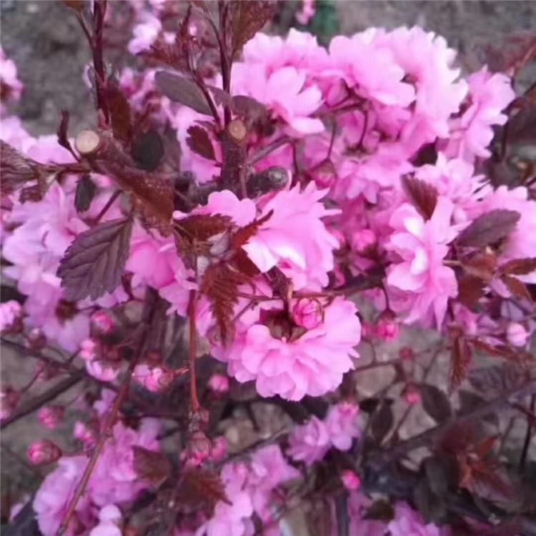 枝紫褐色,叶宽椭圆形至倒卵形,先端3裂状,缘有不等的粗重锯齿;花单瓣至重瓣,紫红色,1~2朵生于叶腋,花期4月;核果红色,近球形,有毛。