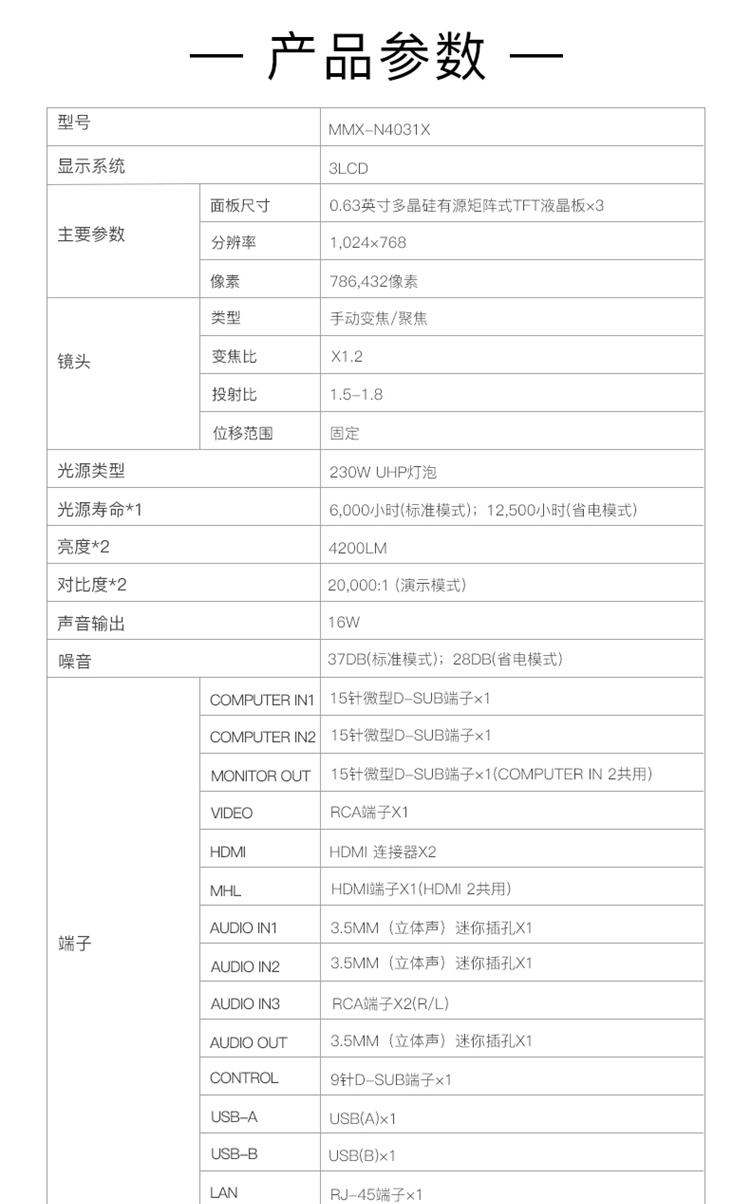| 光源寿命(省电模式) | 12500小时 | 亮度 | 4200lm |