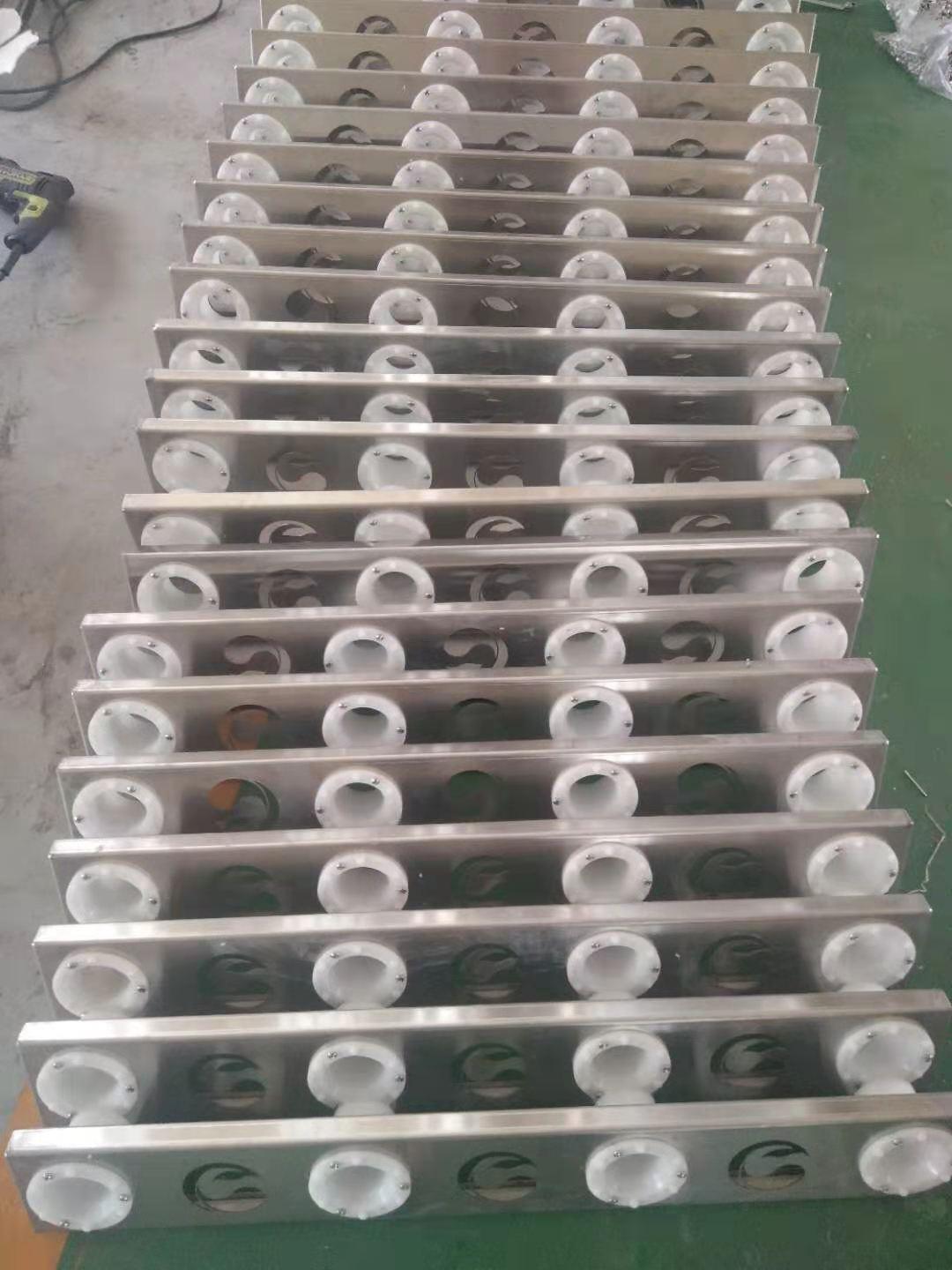 清洗工序:经过桶外清洗机清洗后的桶由上桶机输送至冲洗部件上桶工位,拦桶气缸将其余桶挡在上桶工位以外,上桶机的推桶气缸把桶推到翻转架上,翻转架将桶翻至横卧状态,翻转气缸到位后,上桶气缸将桶顶入桶盘座中,置于桶盘座内塑桶,随着链条向上转90°,此时塑桶由原来横卧状转变为倒立状,桶头朝下进入碱液、消毒液、成品水清洗工位。
