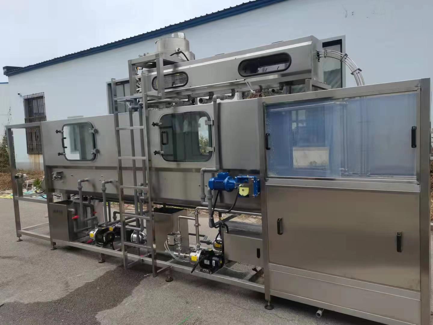 清洗工序:经过桶外清洗机清洗后的桶由上桶机输送至冲洗部件上桶工位,拦桶气缸将其余桶挡在上桶工位以外,上桶机的推桶气缸把桶推到翻转架上,翻转架将桶翻至横卧状态,翻转气缸到位后,上桶气缸将桶顶入桶盘座中,置于桶盘座内塑桶,随着链条向上转90°,此时塑桶由原来横卧状转变为倒立状,桶头朝下进入碱液、消毒液、成品水清洗工位。