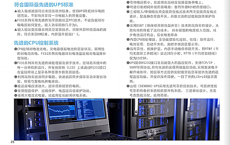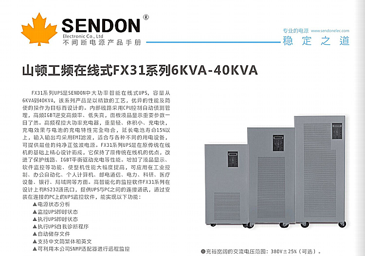FX31系列UPSSSENDON中大功率智能在线式UPS,容量从 6KVA到40KVA,该系列产品是以精致的工艺,优异的性能及简便的操作为目标而设计的.内部域路采用CPU®制自动侦测管理,高頻IGBT逆变高頻率,低失貝,面板液晶参数一目了然. 离频程控大功率充电器,体积小、充电快, 充电效果与电池的充电特性完全吻合,延长电池寿命15%以 上,适合与各种不同的用电设备, 可提供纯浄正弦波电源.FX31系列UPS是在原系统在线的基础上精心设计而成,它保持了原传统在线机的优点,改逬了保护线路、IG8T平衡驱动充电等性能.増加了液网显示、 软件监控等功能・使整机性能大福度提升,可应用在工业控制、办公自动化' 邮电通信、电力,科研.医疗 设备、银行' 局域网等方面.高普能化的监控软件FX31系列在 设计上有RS232通讯口,提供UPS与PC之间的连接通讯,通过安装在连接的PC上的UPS监控软件,能实现以下功能: