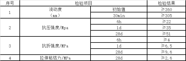 | 抗压强度(28d) | ≥51MPa | 抗折强度(6h) | ≥4MPa |