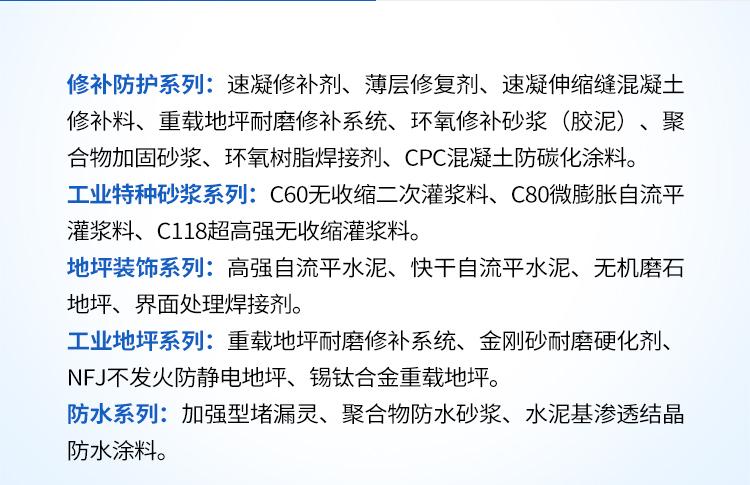 • 主营产品: 快速修补料、注浆料、灌浆料、修补砂浆、自流平、地坪、建筑加固