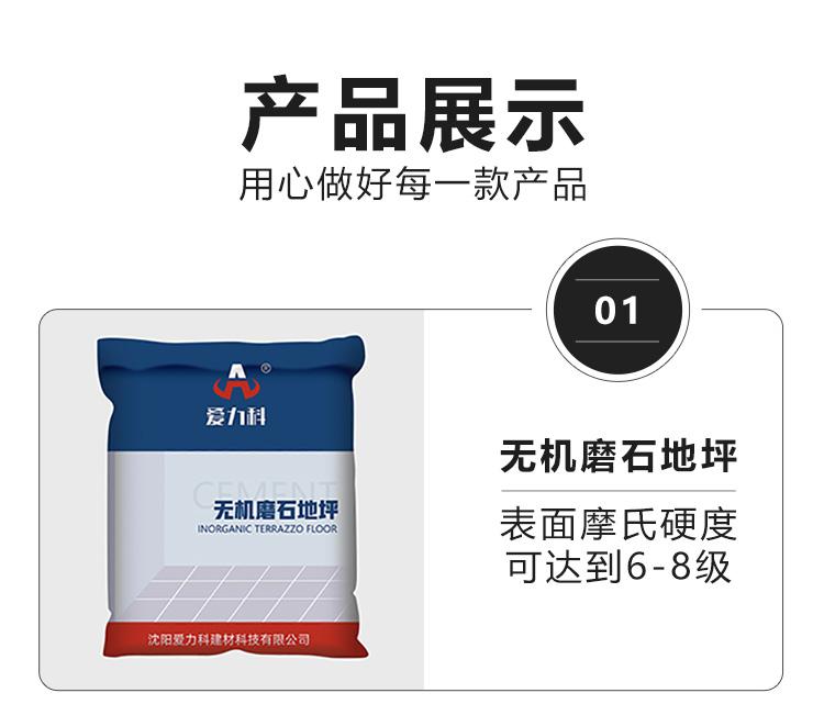爱力科牌无机磨石地坪是一种区别于传统水泥磨石的快干型新型磨石,以改性聚合物类无机胶结材料为主,辅以天然彩色精细骨料与人工骨料,经现场混合、浇筑、摊铺、打磨、精细抛光至设计标高(一般在12mm以上)的精细磨石地坪。