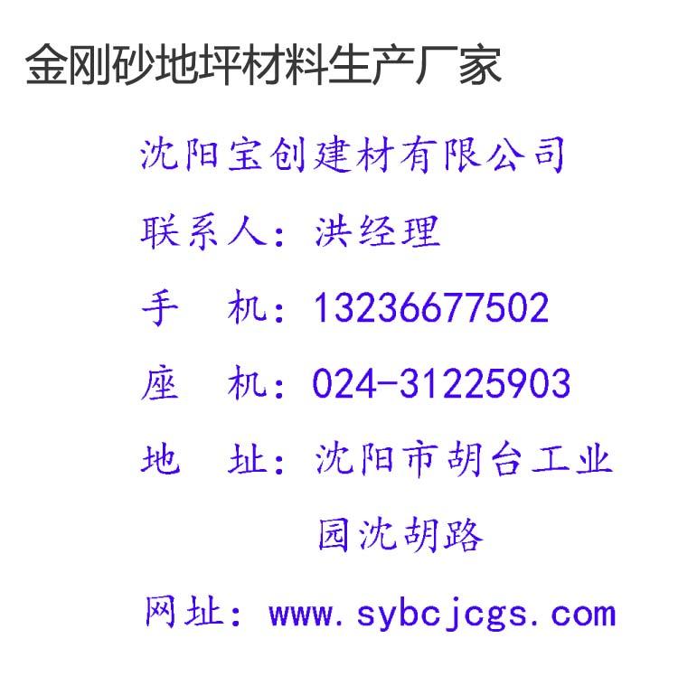 沈阳宝创建材有限公司坐落于沈阳市胡台开发区,主要生产金刚砂耐磨地坪材料,地坪养护剂等产品,广泛用于厂房,仓库,地下停车场,码头,重工业车间等混凝土地面。品种齐全,质量上乘,颜色鲜艳吸水性好,容易施工。颜色:本色,灰色,绿色,红色,蓝色等各种颜色,特殊颜色与材料可以根据客户要求来定制加工。并配有专业的施工队伍,为客户打造优质的金刚砂耐磨地坪,实现一体化地坪服务系统,欢迎客户来电咨询!!!