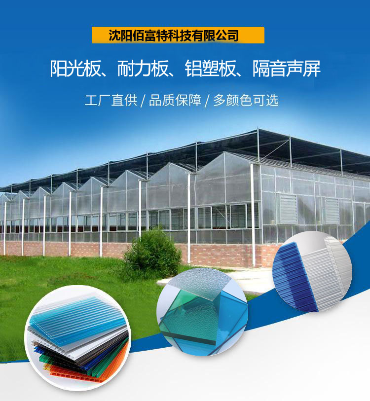 沈阳佰富特科技有限公司 是一家阳光板专业生产、销售、设计安装为一体的机构。拥有一批高素质、高技术的安装团队。公司主要产品聚碳酸酯(PC)阳光板、耐力板、聚碳酸酯(PC)结构板、颗粒板、U型结构板、温室专用防滴露阳光板、PE温室大棚板、磨砂板、晶透板、浪板、多层格子板、采光罩、铝合金压条、铝型材收边、自攻螺丝,承接工程。