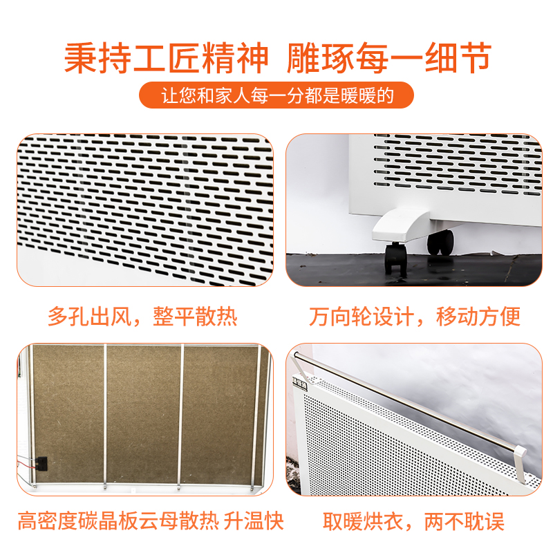 3、散热均匀:本品采用散热最快的高密度碳晶发热板为发热体,高科智能,恒温辐射,使空间温度循环辐射,相互对流产生极强的热传导。