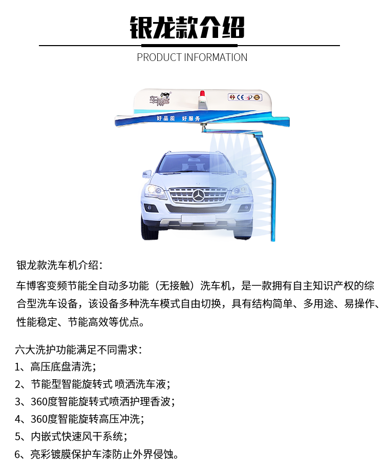 | 类型 | 无接触全自动洗车机 | 洗车流程 | 底盘冲洗、免擦洗车、高压冲洗、驱水镀膜、强力风干 |