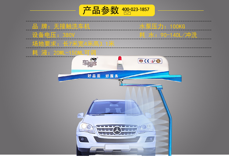| 类型 | 无接触全自动洗车机 | 洗车流程 | 底盘冲洗、免擦洗车、高压冲洗、驱水镀膜、强力风干 |