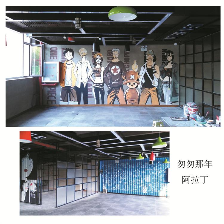 二次元漫画墙体彩绘 网吧网咖手绘创意设计 漫画世界照入现实
