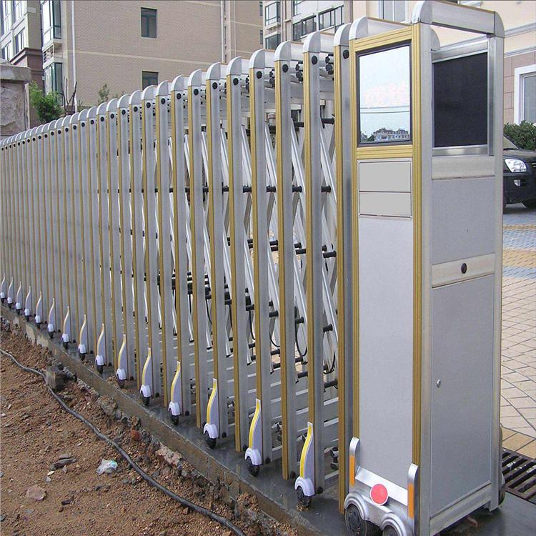电动伸缩门别名“电动门“”或“电动折叠门”。电动伸缩门主要由门体、驱动器、控制系统构成。伸缩门的门体采用优质铝合金及普通方管管材制作,采用平行四边形原理铰接,伸缩灵活行程大。