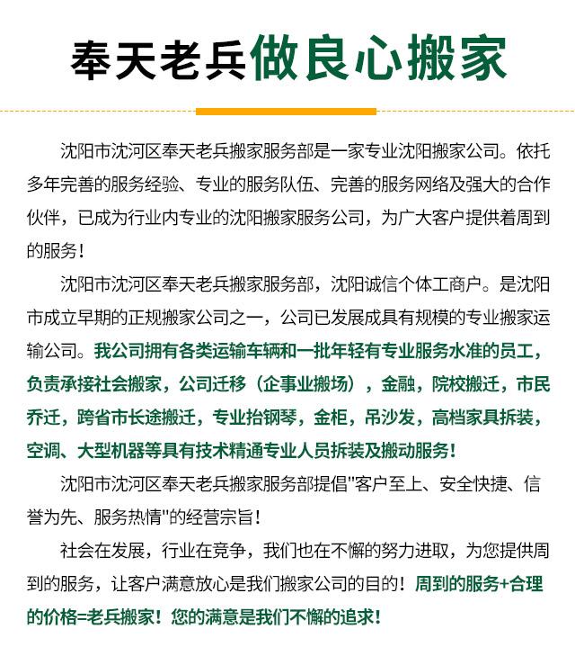 沈阳市沈河区奉天老兵搬家服务部提倡"客户至上、安全快捷、信誉第一、服务热情"的经营宗旨!