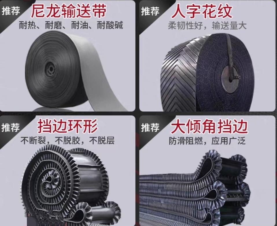 按结构形式可分为:裙边输送带,带挡板输送带,带导条输送带,环形、开口输送带。
