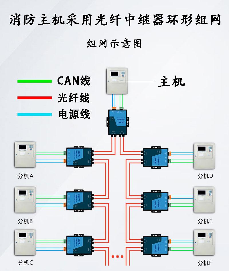 使用GCAN-208-2-F(双路光纤模块)环网专用的光纤中继器,可以实现多台消防设备需要连接的时候进行环形组网。每台主机只需要使用一台GCAN-208-2-F设备,主机上的CAN总线经过光纤转换器转成光信号,然后光纤转换器的另一端用光纤线进行手拉手式环形连接 ,组成一个闭环网络。该方案可以实现总线网络内所有主机数据共享,并且在任何一台主机的CAN接口上可以接收到其他所有节点的CAN数据,进而任何报警信息都能在第一时间知晓。