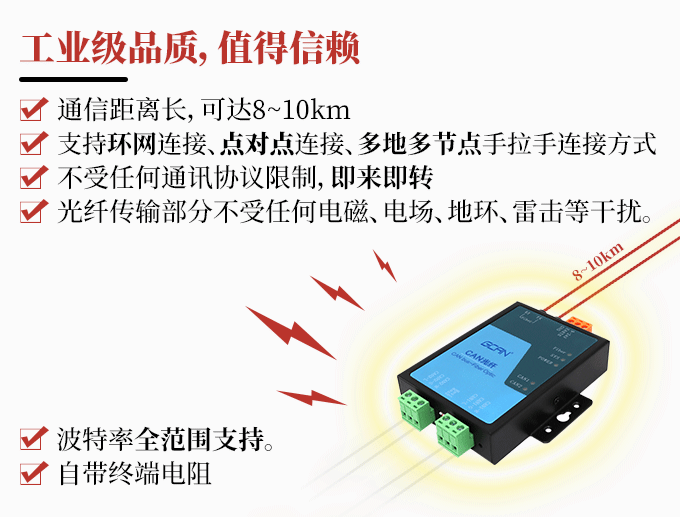 应用场合:某些单独分散的总线节点间需要远距离通讯,或者受干扰严重需要电气隔离。