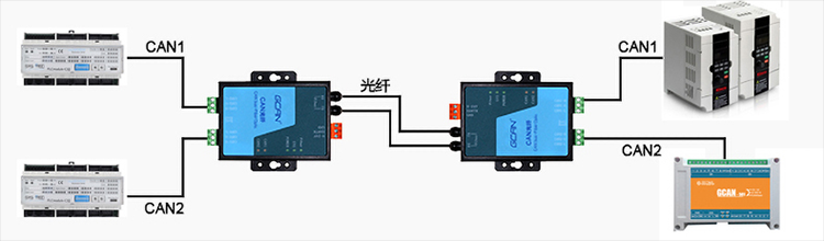 两个PLC设备分别接到光纤CAN的两条CAN总线,分别控制远端节点的两个设备(CAN1与CAN1通信,CAN2与CAN2通信)