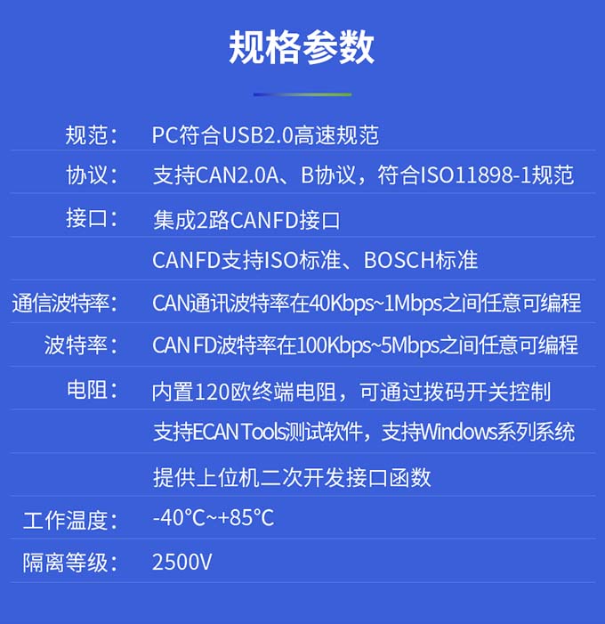 | 规范 | PC符合USB2.0高速规范 | 协议 | 支持CAN2.0A、B协议,符合IS011898-1规范 |
