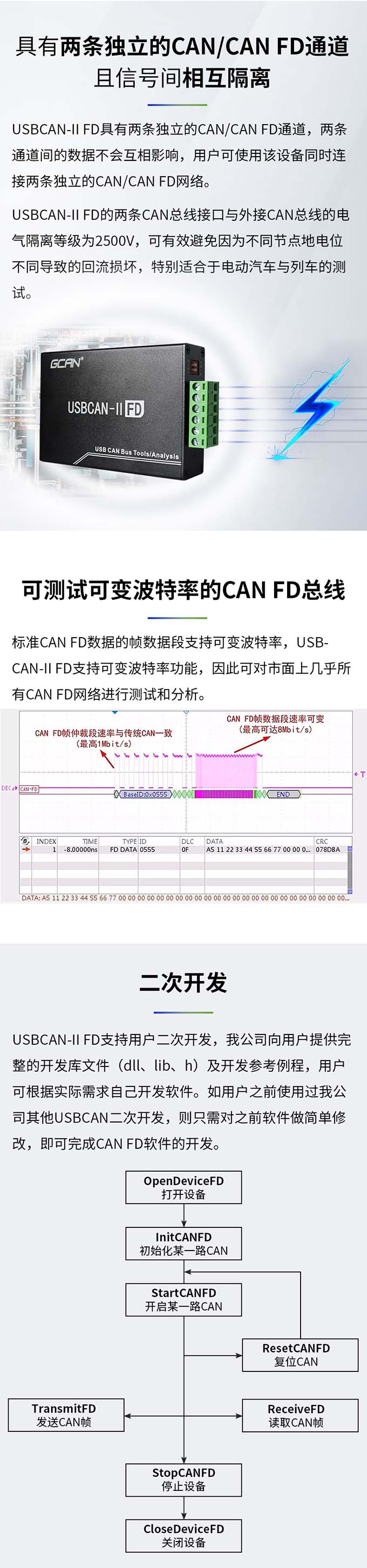 USBCAN-II FD是专门用于调试、分析CAN FD网络的工具,该模块提供的.上位机软件支持Windows7/Win-dows10等Windows操作系统,针对二次开发用户,我公司提供二次开发函数库和例程,用户可以参照例程使用函数库自己开发软件,可广泛应用于产品开发、数据分析等。