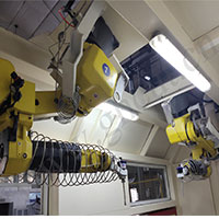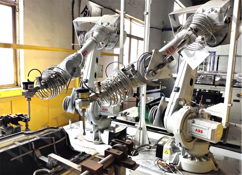 双机器人双工位水切割工作站工作介绍:机器人水切割工作站开始工作时,机器人总控系统对机器人进行控制,首先开始切割的工位是A工位,当A工位的零件切割完毕之后,机械手将会自动旋转至B工位,对B工位进行切割,A工位更换汽车内饰件,这样可以实现机器人不间断的工作,提高切割效率。