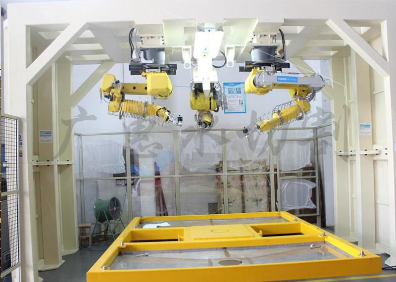 机器人水切割工作站常用于汽车内饰切割工厂,汽车上面有很多复合材料板,由于这些材料的特殊性质,必须使用机器人纯水切割进行切割才能符合产品要求,