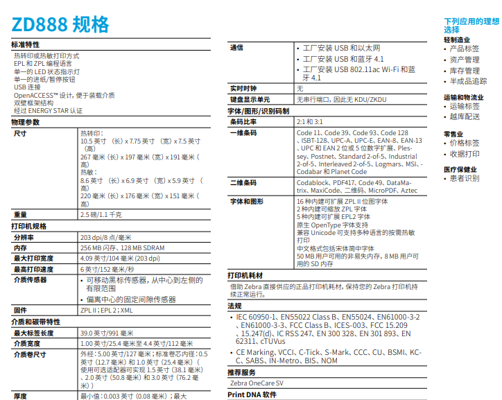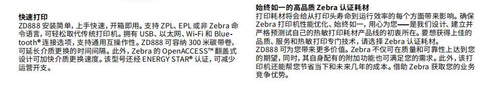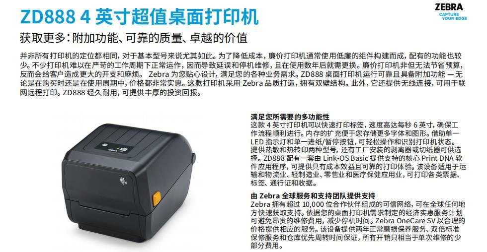 ZD888 桌面打印机配有的热敏和热转印两种型号均采用 Zebra 质量打造,并提供附加功能,运行可靠且价格实惠。可容纳 300 米碳带卷,提供无线连接,打印更快速 — 均由 Zebra 服务和支持团队提供支持。获取更多:借助 Zebra 获取竞争优势。