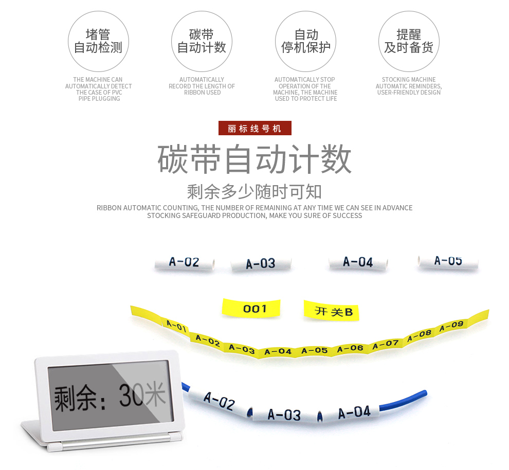 | 贴纸规格 | 6mm、9mm、12mm宽(白、黄、银三色) | 其他耗材 | 4mm标志条(盒装5M长);热缩管 |