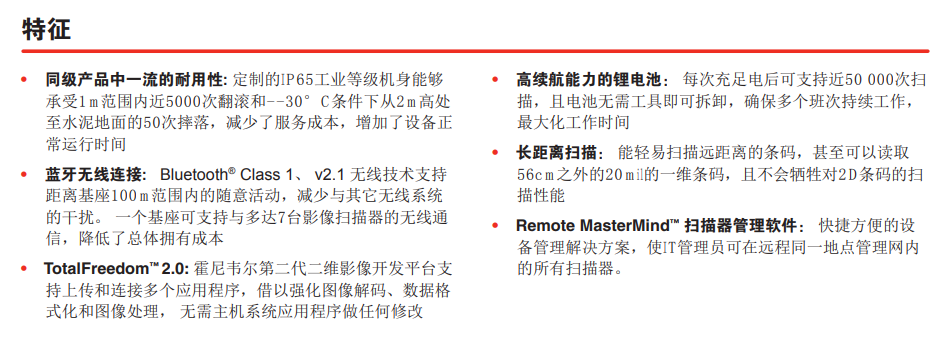 | 扫描次数 | 每次充电可支持多达50,000次扫描 | 电池 | 最小2000 mAh Li-ion |