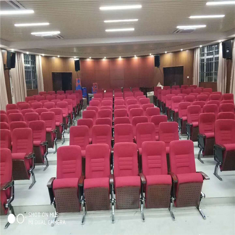 礼堂椅主要结构由椅座、椅背、扶手、书写板和站脚几部分构成。支架采用冷轧钢冲压、焊接、打磨及表层高温静电喷涂处理,脚架是铝合金,脚架一般采用地面固定结构,也可根据场地需要改用活动脚;座椅及靠背均采用高弹力定型海绵+多层板内板+麻绒布面外边,座背外壳可采用PP聚丙烯工程塑胶或多层板贴木皮喷漆面;扶手面采用进口实木喷漆面;写字板可采用PP工程塑胶或木板面。座椅一般会带有静音自动归位功能,写字板为内藏扶手式结构;