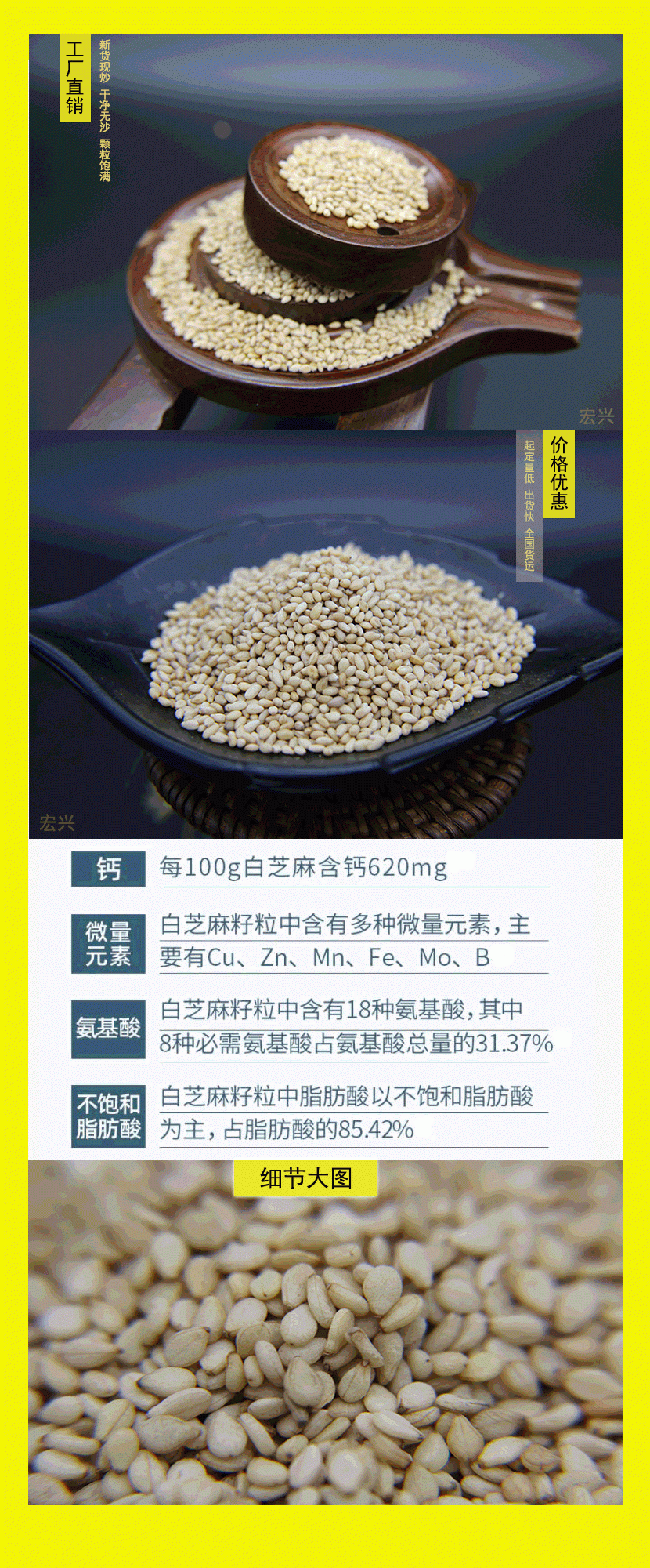 宏兴芝麻产自阳光充沛的地区,芝麻颗颗饱满 粒粒醇香,经过多重工序层层筛选,严格把控质量关,生产出的芝麻色香味全,为了回馈新老客户的喜爱,现在订购芝麻不同品种不同数量均有优惠,您可以拨打13079288288(同步微信)或点击宏兴官网http://www.hx024.com了解!