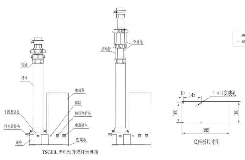 TSGⅢL型电动升降杆采用减速电机、丝杠、丝母及钢丝绳传动倍伸机构原理,各节活动管同时升降,升降速度快。外观可见钢丝绳,可在任意高度自锁。