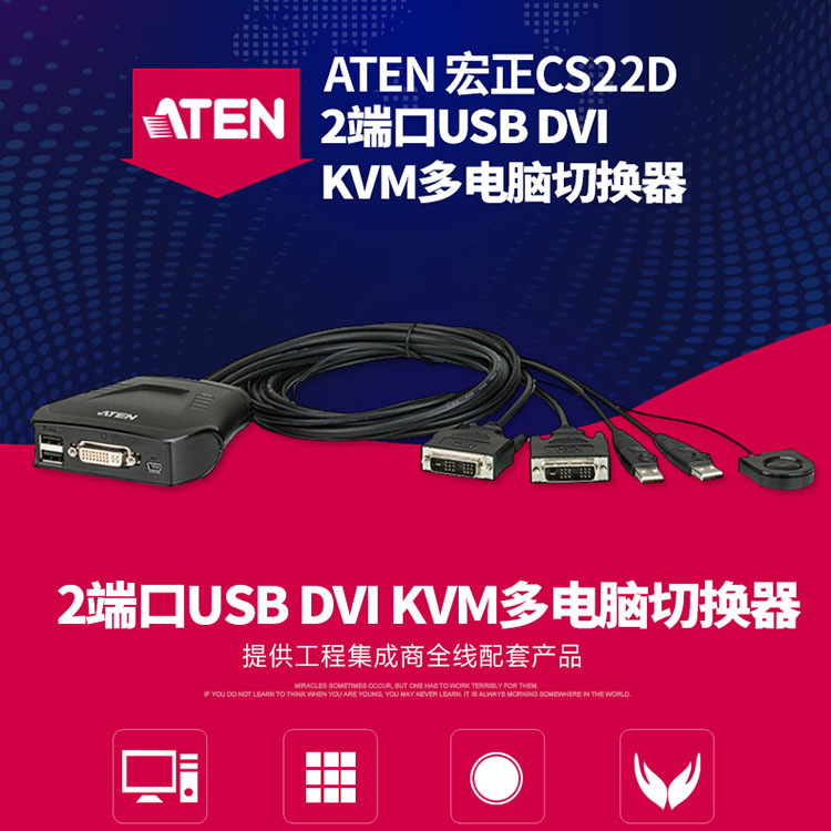 CS22D是一款2端口USB DVI KVM多电脑切换器,用户可通过一组USB和DVI控制端(键盘、鼠标和显示器)控制两台电脑,并可通过外接式切换按键,简单且快速地切换电脑。 CS22D精巧一体成型的设计,最适用于需要跨平台桌面应用的用户。
