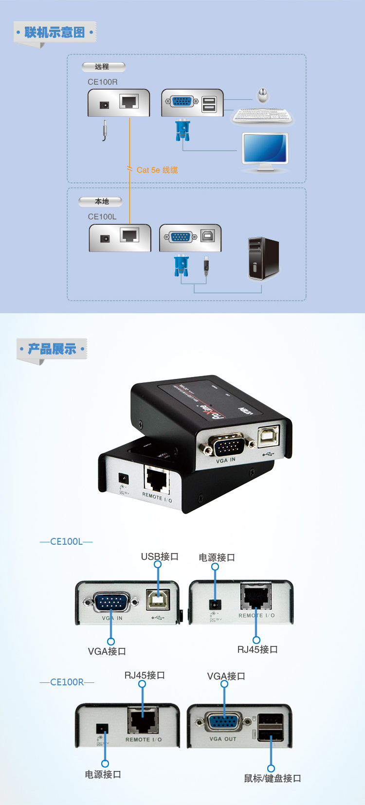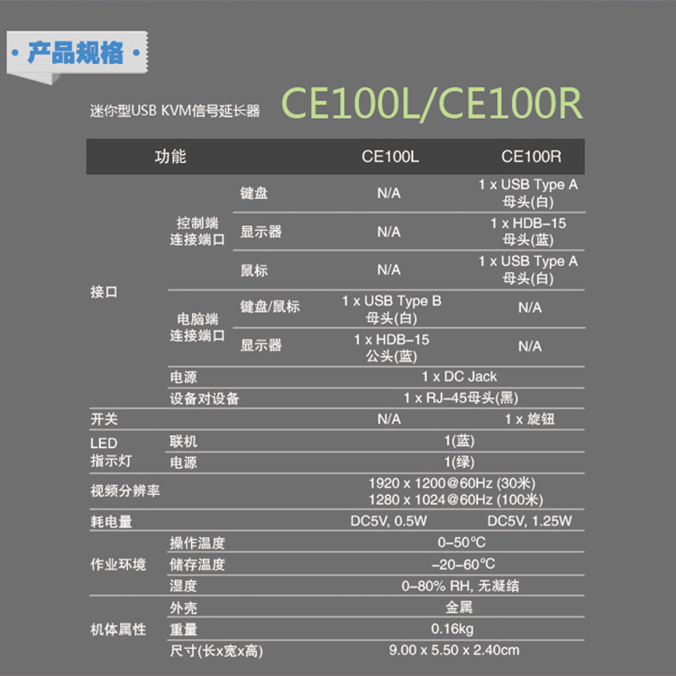 CE100 USB KVM信号延长器具备优异的视频质量且内建静电放电(ESD)保护,可让用户从远程USB控制端(USB键盘、USB鼠标与显示器)访问电脑。 CE100强化了先前的设计:1) 于远程设备使用补偿调整功能以获得更好的影像质量;2) 采用价格实惠的Cat 5e线缆,取代笨重且昂贵的标准线缆,以提供更简洁、方便、稳定的信息传输连接。