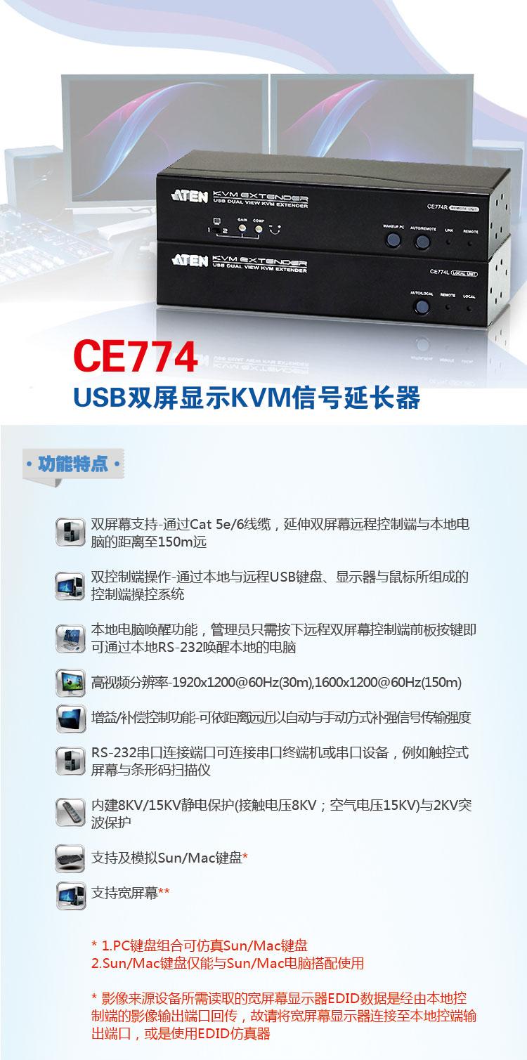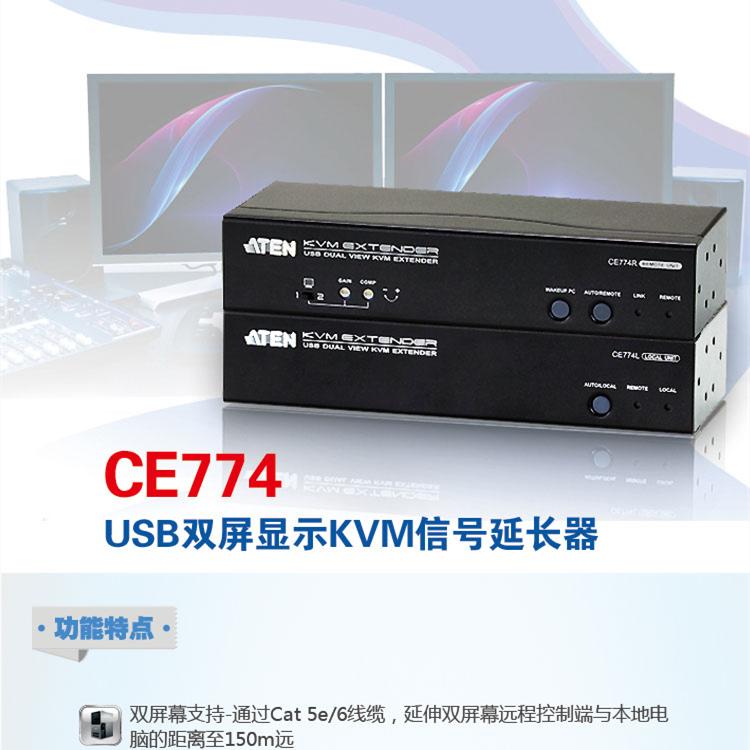 ATEN宏正CE774 USB双屏幕KVM信号延长器,通过Cat 5e/6线缆可延伸双屏幕远程控制端与本地电脑的距离达150m。双屏幕功能可让两组视频信号同时显示在两组屏幕上。CE774并具有进阶唤醒本地电脑功能,可让管理员只需按下远程双屏幕控制端前面板按键,即可通过本地RS-232唤醒本地的电脑,无需亲自到本地手动唤醒本地电脑。消除了管理员需奔波于本地电脑与远程控制端之间,也让管理更有弹性及效率