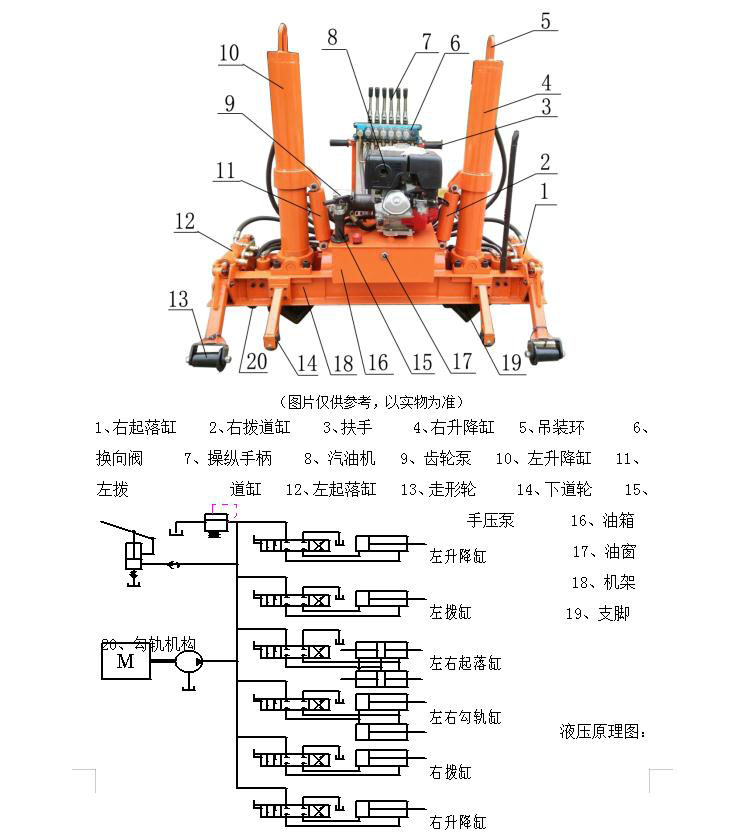 本机由内燃发动机、齿轮泵和多路换向阀、起道机构、拨道机构、钩轨机构、起落机构、下道装置、手动油泵等组成。