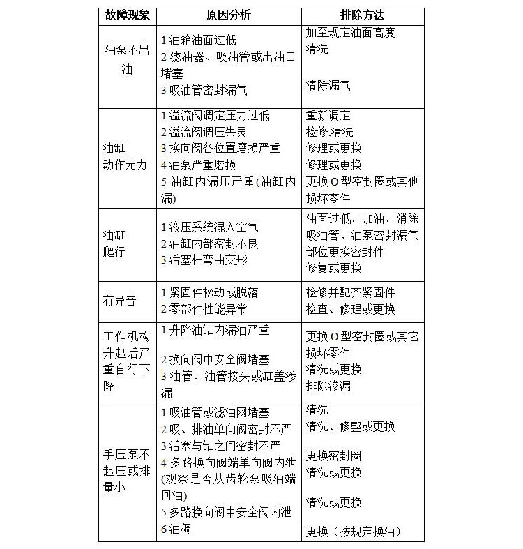 4.1检查液压系统工作是否正常,有无渗漏油现象,如发现异常,应解体检查确认液压件是否磨损,密封件是否损坏,油路是否畅通,确认后,更换相应的零部件或密封件及清理油路。