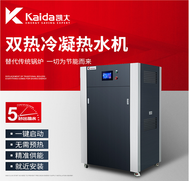 凯大即开式模块热水机组,5秒内即可产生热水,双冷凝热水技术,热效率高达98%, 具有安全、快速、节能、环保、耐用等特点,体积小、大功率、模块化设计、使用方便;无内胆结构、非压力容器、不属于特种设备,没有危险性,可就近安装,无需办理锅炉证,无需年审,一键操作,智能控制;应用领域广泛:热水工程、恒温泳池、采暖工程、洗浴配套、酒店学校医院部队热水工程等。具有传统锅炉无法比拟的优势,是替代传统锅炉的好产品之一,具有非常好的市场发展空间。