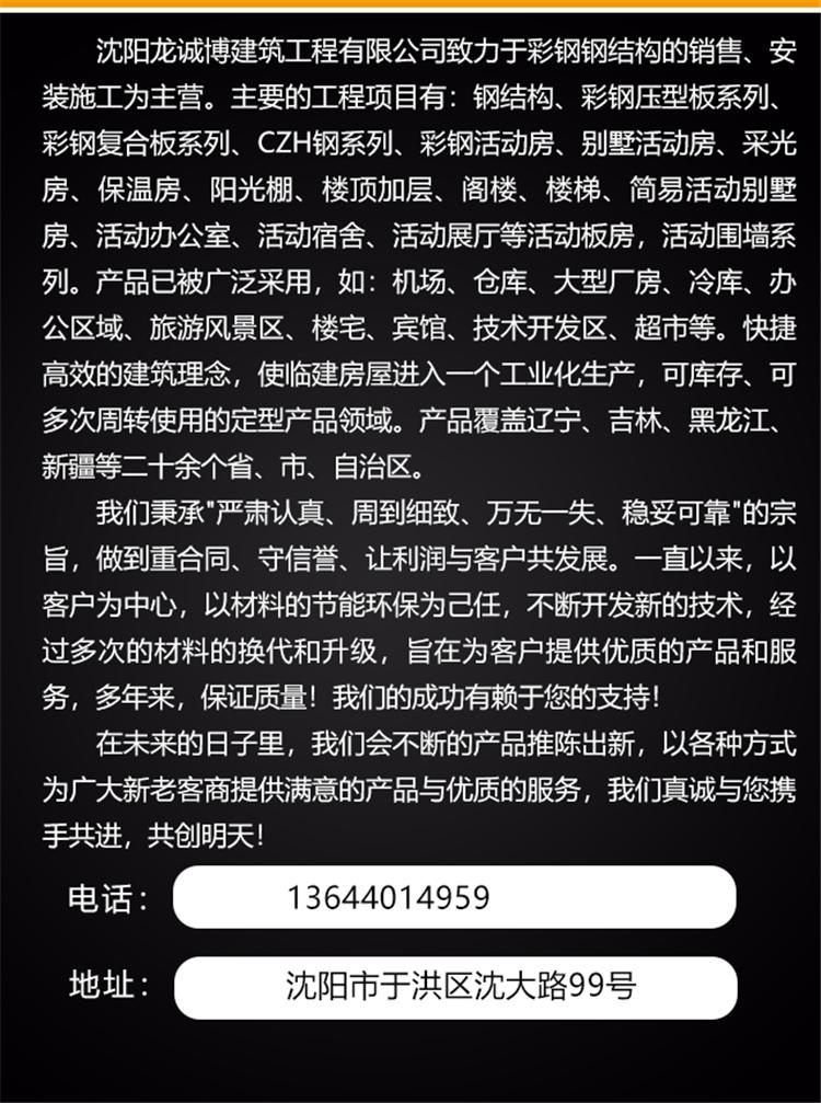 彩钢板、楼承板、活动房、集装箱、钢结构、钢结构加工、钢结构加固、楼房改造、铝单板| 产地 | 沈阳 | 加工定制 | 是 |