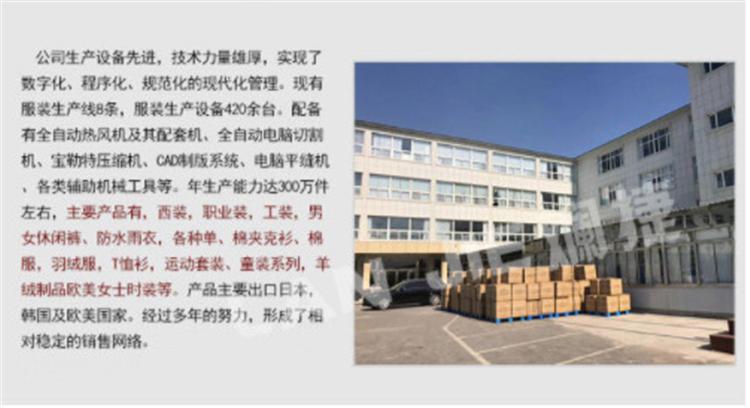 主营:西装,职业装,工装,男女衬衫,男女休闲裤、防水雨衣,各种单、棉夹克衫、棉服,羽绒服,T恤衫,运动套装