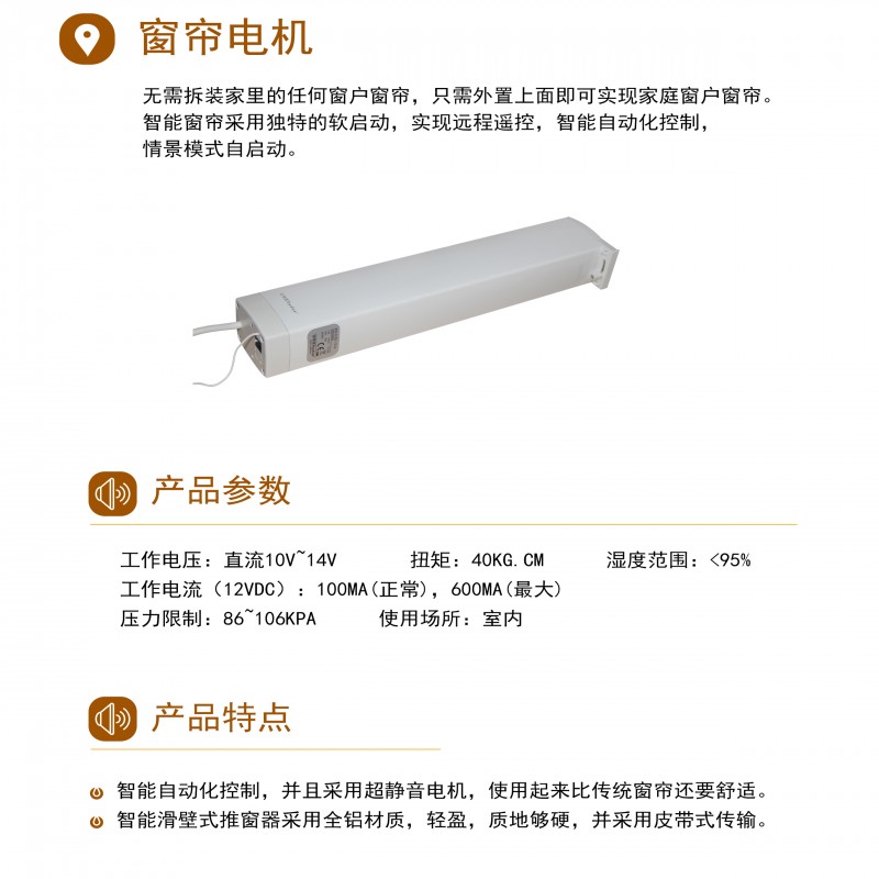 7商品描述:无需拆装家里的任何窗户窗帘,只需外置上面即可实现家庭窗户窗帘。智能自动化控制,并且采用超静音电机,使用起来比传统窗帘还要舒适。智能窗帘采用独特的软启动,实现远程遥控,智能自动化控制,情景模式自启动。智能滑壁式推窗器采用全铝材质,轻盈,质地够硬,并采用皮带式传输。