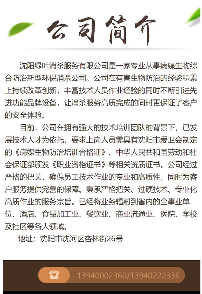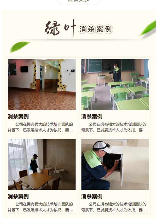 | 服务种类 | 蟑螂、蚊蝇、老鼠、跳蚤等 | 应用范围 | 宾馆、酒店、学校、医院等 |