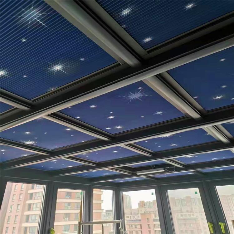 沈阳美萨阳光房厂家直销 配备多种类型遮阳产品 全自动户外天幕 天幕遮阳篷也称作户外遮阳天幕,是室外顶部专业配套应用的伸缩篷,隔热效果远胜于玻璃房各种室内遮阳产品