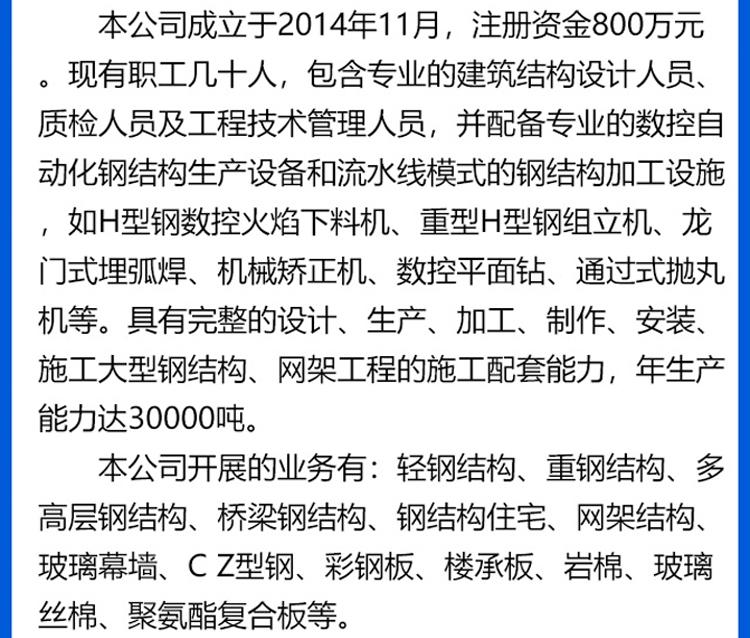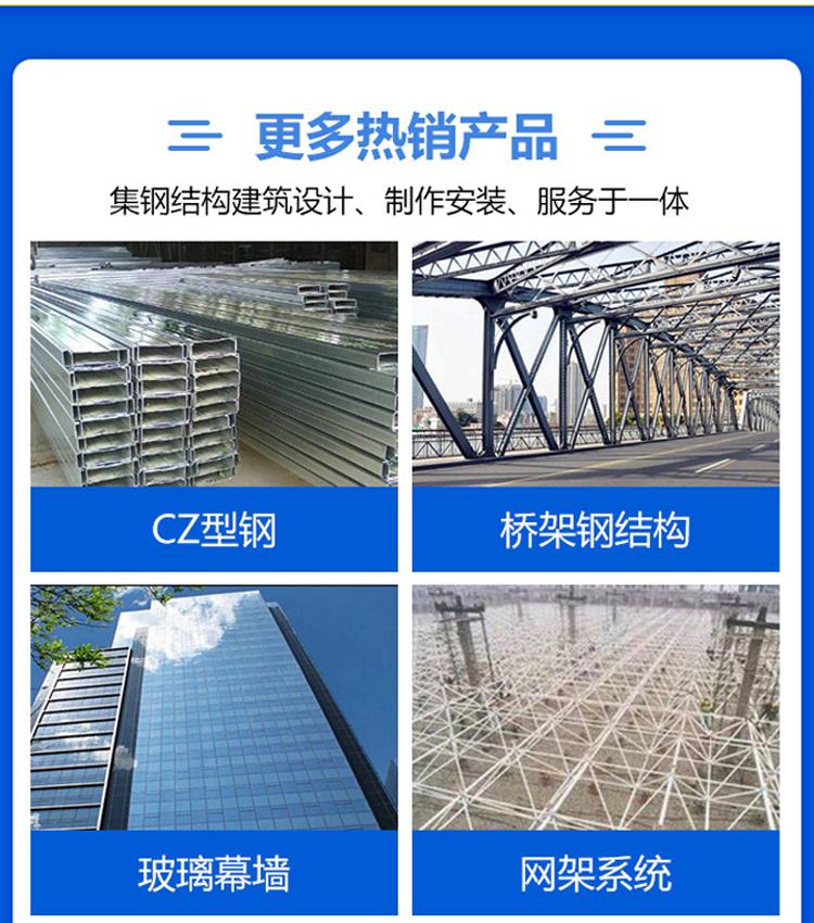 主营:轻钢结构、重钢结构、多高层钢结构、桥梁钢结构、钢结构住宅、网架结构、玻璃幕墙、C Z型钢、彩钢板、楼